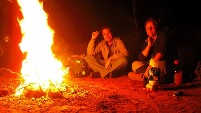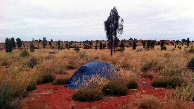 Hava kararmadan oradan ayrıldık. Önce Yulara’ya dönüp camping alanının ücretlerini öğrendik. Kişi başı 17$ olan ücreti ödemeye niyetimiz olmadığı için kendimizi ulusal parkın dışına attık. Park sınırları içerisindeki bu ücretli yerler veya hostel ve oteller dışında konaklamak yasak olduğundan, biz de kampın hemen dışında çalılıklar arasında bir kamp yeri bulduk. Çadırlarımızı kurduk. Güneş battıktan sonra hava hızlıca soğumaya başlamıştı. Çevreye dağılıp kuru ağaç dalları toplayıp ateşimizi yaktık.