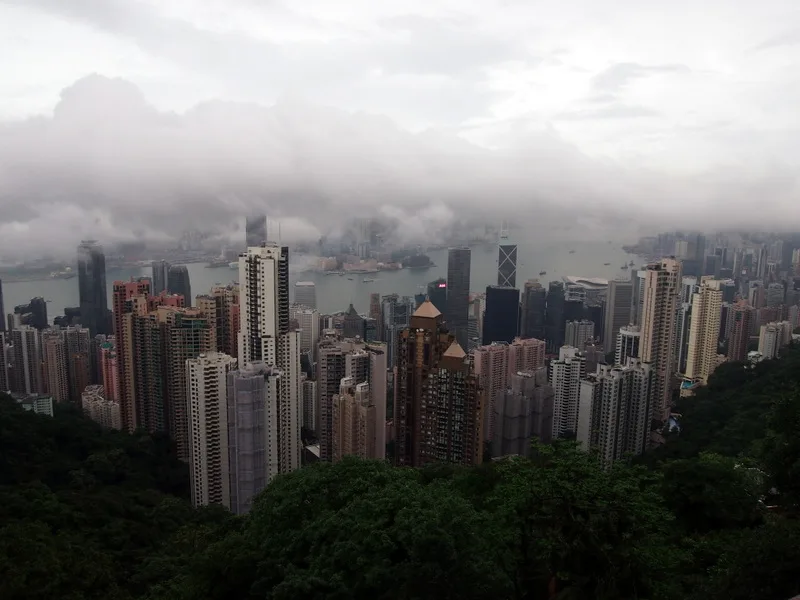 At this point an unexpected hiccup occurred in my perfectly planned day. The clouds came down and it began to rain quite heavily. The end of May/beginning of June marks the start of the rainy season in Hong Kong. The free raincoat now made perfect sense! It was still raining as the bus turned inland and back to the west. However, I got off as planned at the entrance to the Peak Tram, even though I could barely see about 30 meters up the mountain. The Peak Tram is Hong Kong’s most famous tram as it goes uphill at a quite steep angle before stopping to let passengers get off in the basement area of ‘The Peak’, the famous building on top of the mountain. The journey takes about 5 minutes and a free return ticket is included in the tour package. I’m sure there is a great view on sunny days….