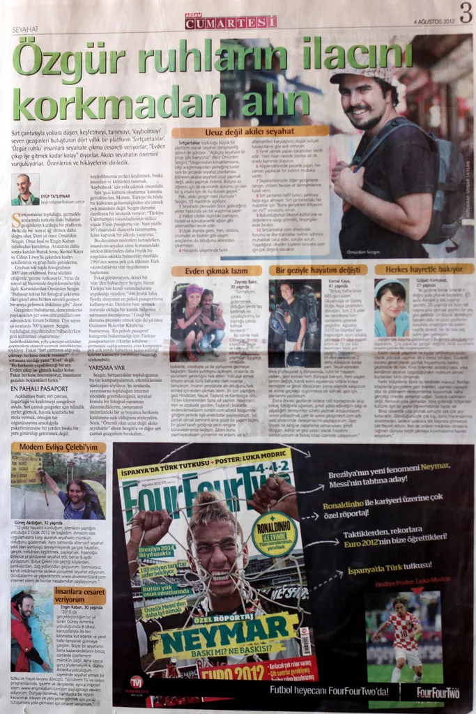 4 Ağustos 2012 tarihli Akşam Gazetesi Cumartesi Eki ve gazetenin web sayfalarında yer aldım. Sırtçantalılar Topluluğu olarak verdiğimiz röportaj, Eyüp Tatlıpınar imzasıyla “Özgür Ruhların İlacını Korkmadan Alın” başlığıyla yayınlandı. Gazetede kendi yol hikâyeni görmek tuhaf bir duygu; bir anda sırt çantası gazete sayfasına dönüşüyor.
