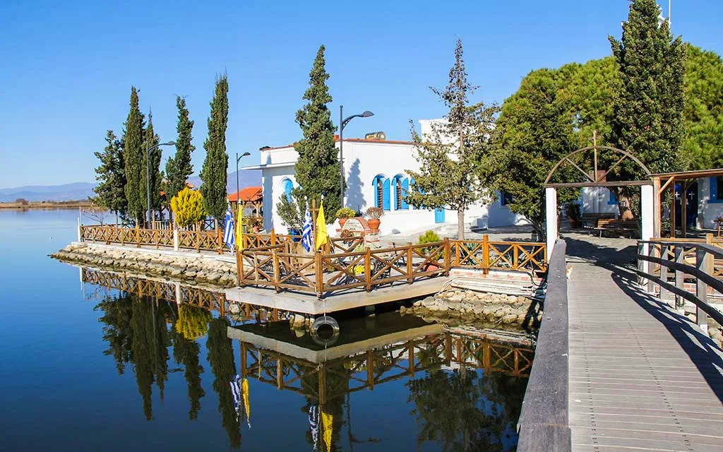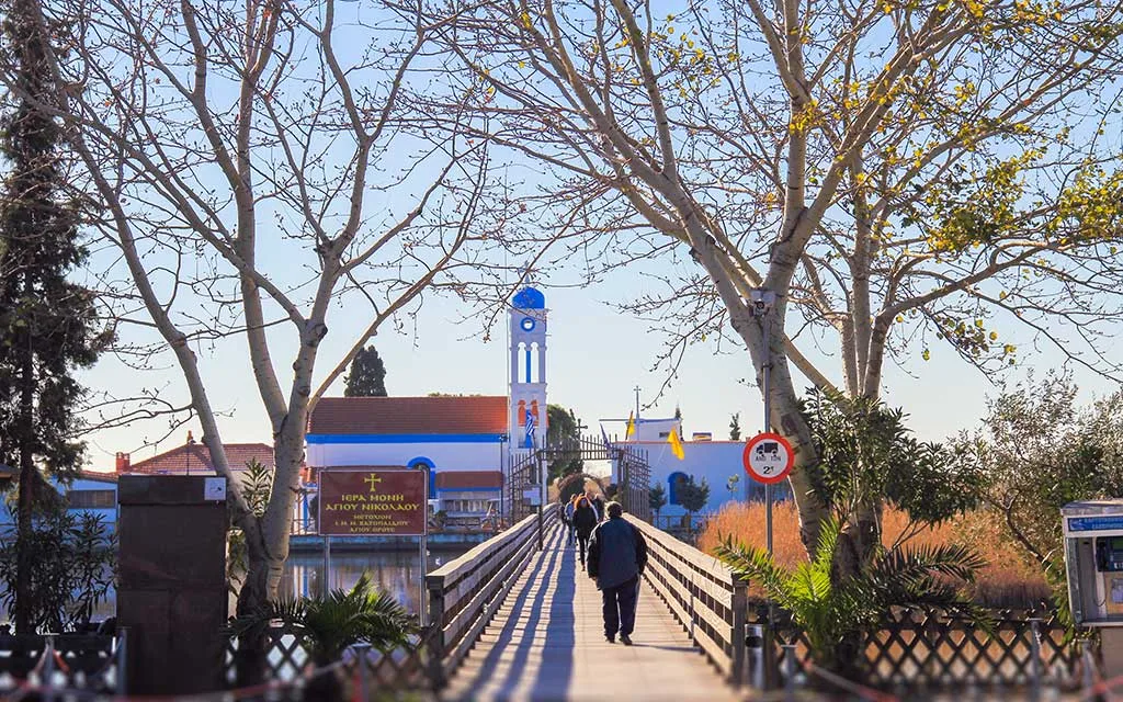 Kiliseye ulaşım oldukça atmosferik. Sazlıkların arasından uzayıp giden ahşap köprüden yürüyorsunuz. Ayaklarınızın altında suyun şırıltısı, etrafta martıların çığlıkları. Zamanın pürüzsüzleştirdiği asırlık ahşap köprü, sizi önce Agios Nikolaos adacığına, oradan da bir başka köprüyle Virgin Mary Pantanassa kilisesine götürüyor.