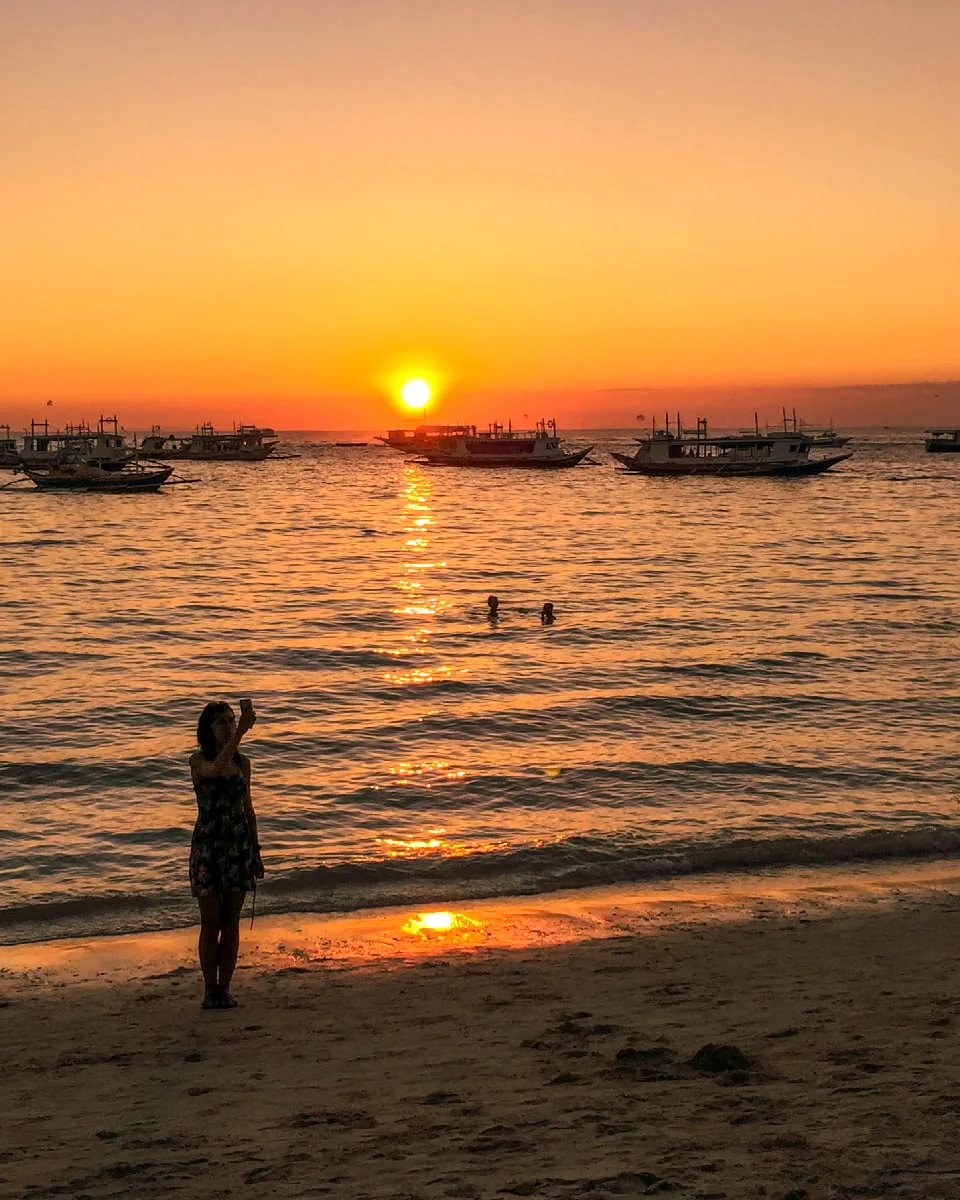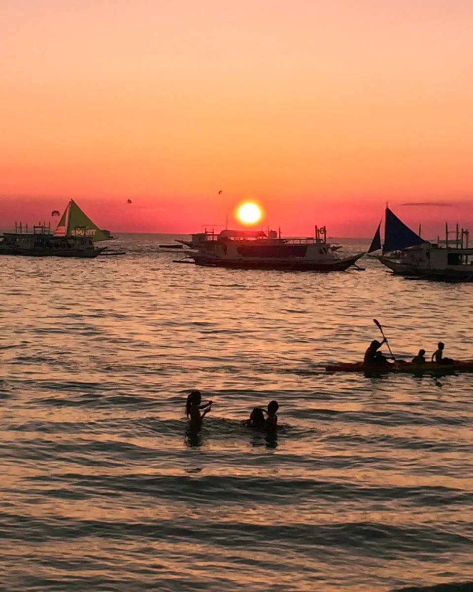 Boracay günbatımı insanı hipnoz edici güzellikte. Hayatımın tartışmasız en güzel gün batımlarından bazısını bu hoş adada gördüm. Öyle arada sırada değil, her akşam gün batımı saatleri tam bir şölen yaşıyorsunuz. Günlük turlardan dönen tekneler sahil boyunca demirliyor. Turlardan gelen insanlar odasına çekilmiş oluyor.