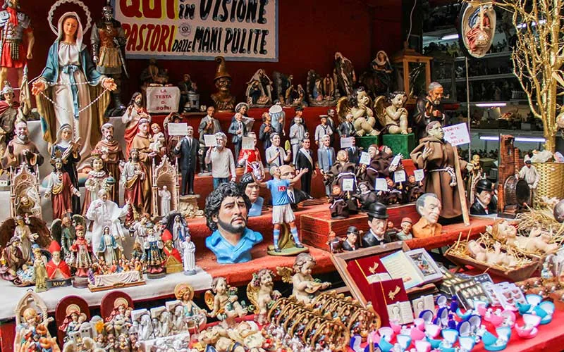 Toprak ve ahşaptan yapılmış çok özel figürler dükkanların vitrinlerini süslüyor. Kimisi kutsal kimisi değil tabi. 18. yüzyılda Napoli’yi çağrıştıran ve aralarında kasapların, fırıncıların, pizzacıların bulunduğu sembolik karakterler, Via San Gregorio Armeno’nun sanatçıları tarafından özenle hazırlanıyor.