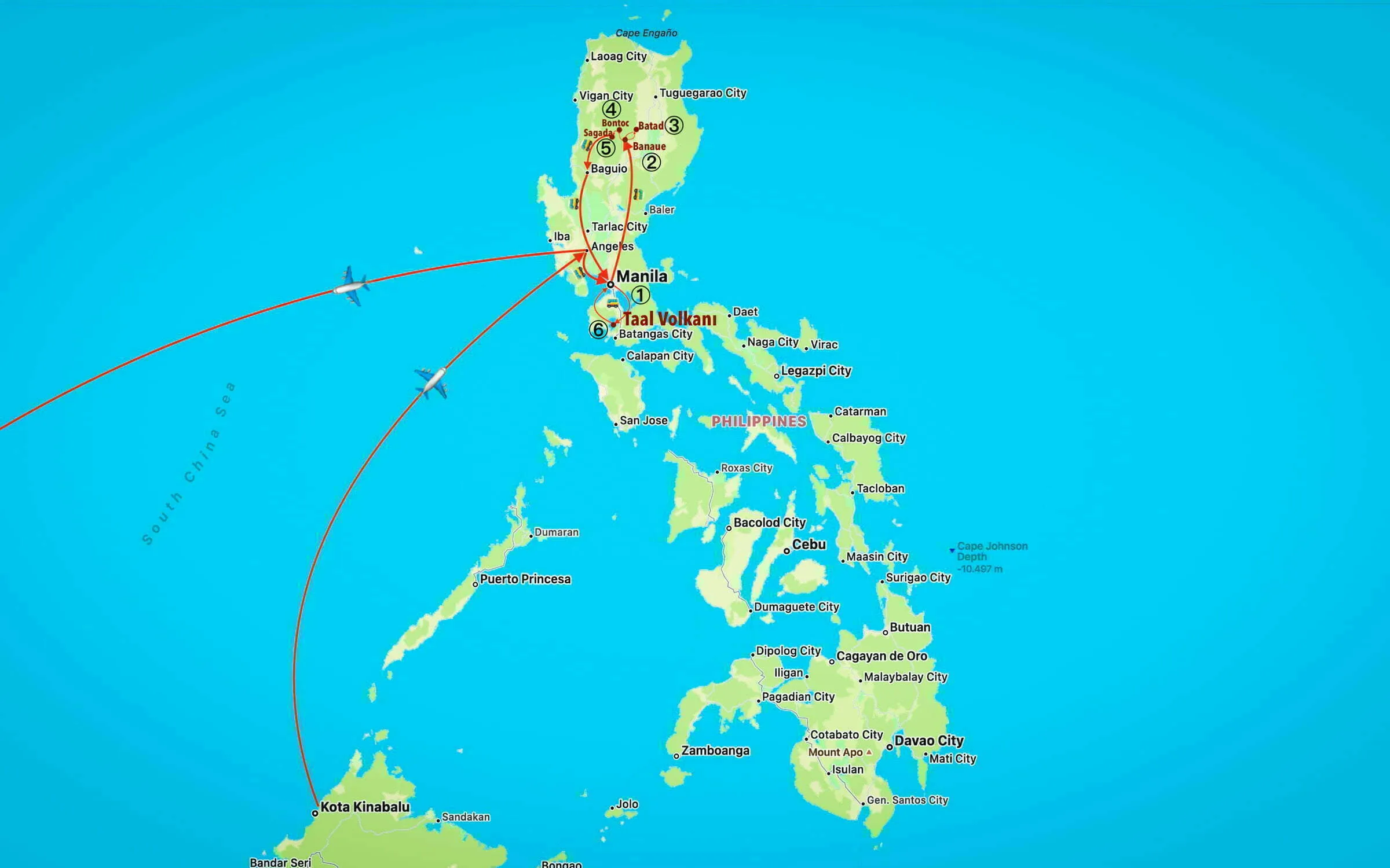 FİLİPİNLER ROTASI 📌 Kota Kinabalu (Borneo, Malezya)✈️ ① Manila 🚍➡ ② Banaue 🚍 ➡ ③ Batad 🚍 ➡ ④ Bontoc 🚍 ➡ ⑤ Sagada 🚍➡ ⑥ Baguio 🚍➡ Manila 🚍 ➡ ⑦ Taal Volcano 🚍 ➡ Manila ✈️ ➡ ⑧ Coron (Palawan) 🚍 ➡ ⑨ El Nido 🚍 ➡ ①⓪ Taytay ⛴ ➡ ①① Puerto Princesa ✈️➡ Manila ✈️ ➡ Singapur (8 Aralık 2011)