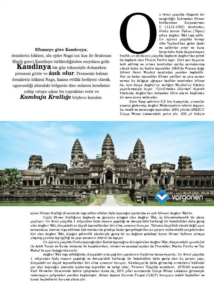 Prensesin babası Naga, kızına düğün hediyesi olarak egemenliği altındaki tüm suları geri çekiyor. Deniz çekiliyor, toprak ortaya çıkıyor. Ve o topraklarda Kambuja Krallığı kuruluyor. Bugünkü Kamboçya’nın adı da işte bu Kambuja’dan geliyor.