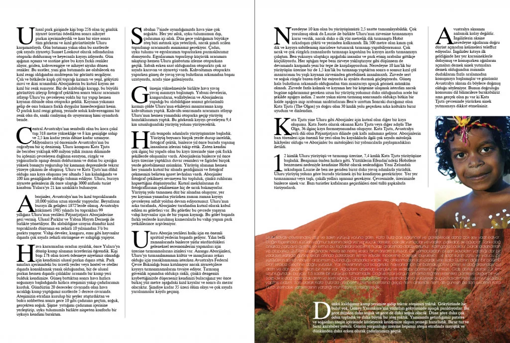 Stil, moda ve yaşam odaklı aylık dergi GUEST’in Haziran sayısında yayımlanan “Avustralya’nın Göbeğinde Aborijinlerinin 600 Milyon Yıllık Kutsal Kayası: Uluru” başlıklı yazımda, Uluru’nun jeolojik oluşumundan kültürel önemine, park içindeki deneyimimden çölde geçirdiğim geceye kadar detaylı bir anlatım bulabilirsiniz.