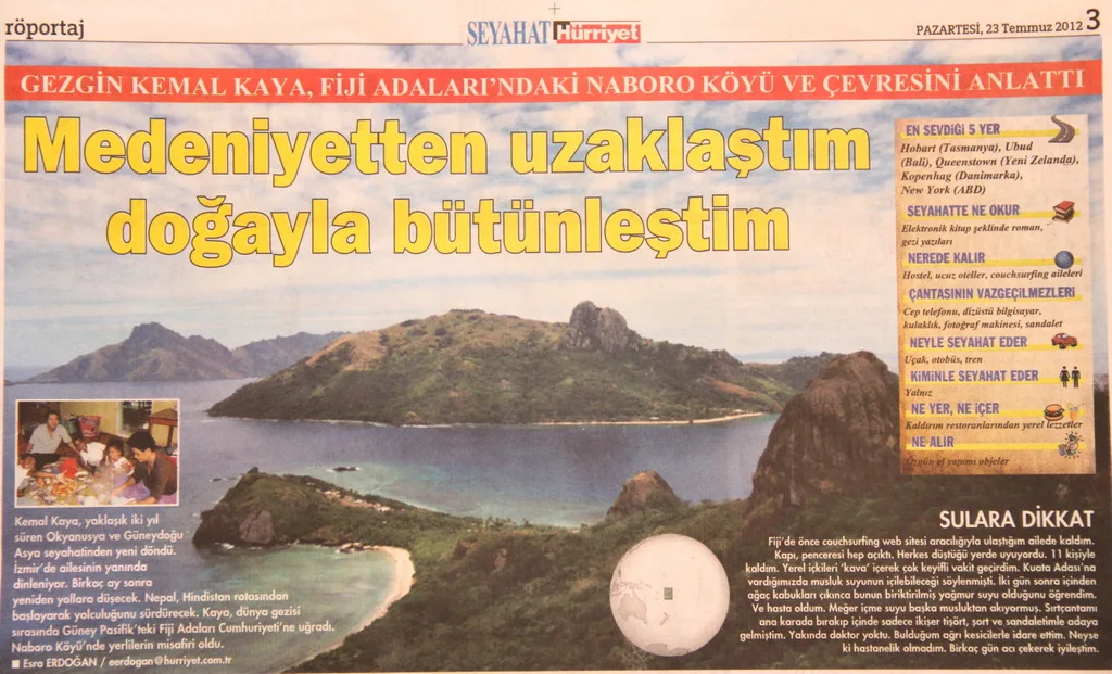 Yeni Zelanda’dan Fiji’ye geçtim. Kuata Adası’nda kaldım. Kanoyla karşıdaki Waya Lai Lai Adası’na geçtim. Orada tanıştığım yerlilerin davetiyle Naboro Köyü’nde iki gün geçirdim. Elektrik, TV, telefon yoktu. Çok sade bir yaşam. Ama inanılmaz bir sıcaklık. Herkes elimi sıkıyor ve “Ne zaman geri geleceksin?” diye soruyordu.
