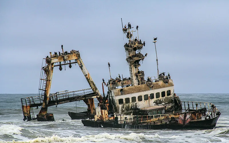 Afrika’nın güneybatısında yer alan Namibya, hemen her köşesiyle oldukça şaşırtıcı ve renkli bir ülke. Bunlardan biri de yüyler ürpertici gemi mezarlığıyla çarpıcı ve ilginç İskelet Sahili (Skeleton Coast). Kuş uçmaz kervan geçmez, merhametsiz Atlantik Okyanusunun gazabına uğramış gemi enkazları bu kıyı boyunca hayalet gemi edasıyla yatıyor.
