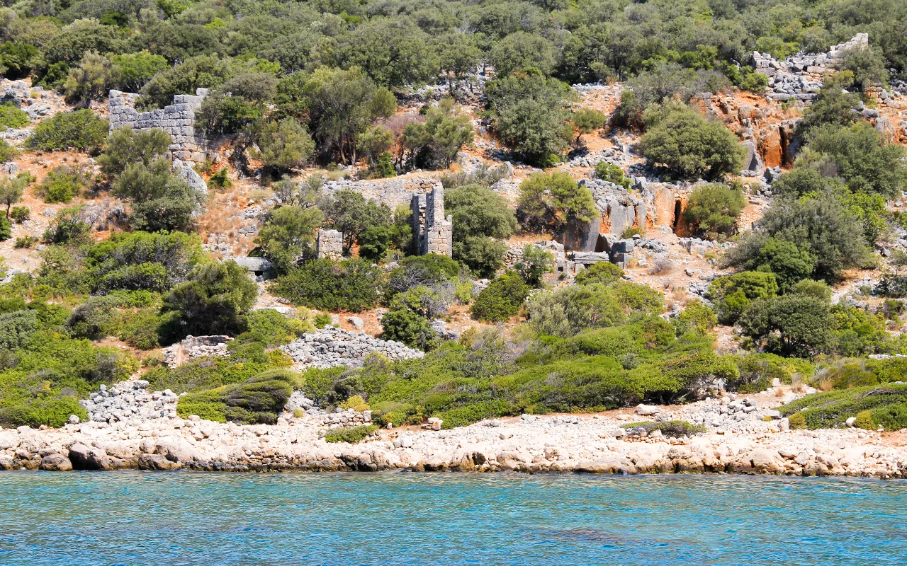 Kayalık alçak bir tepe üzerinde yer alan kalesi, denizin içerisinde bulunan sur parçaları ve kentin doğusunda kaya içine oyulan iskelesi ile şehir doğal bir liman görünümünde. Oysa ki Likya Döneminde bölgenin önemli liman kentlerinden biriydi. Depremlerden etkilenen antik kentten geriye çok az şey kalmış.