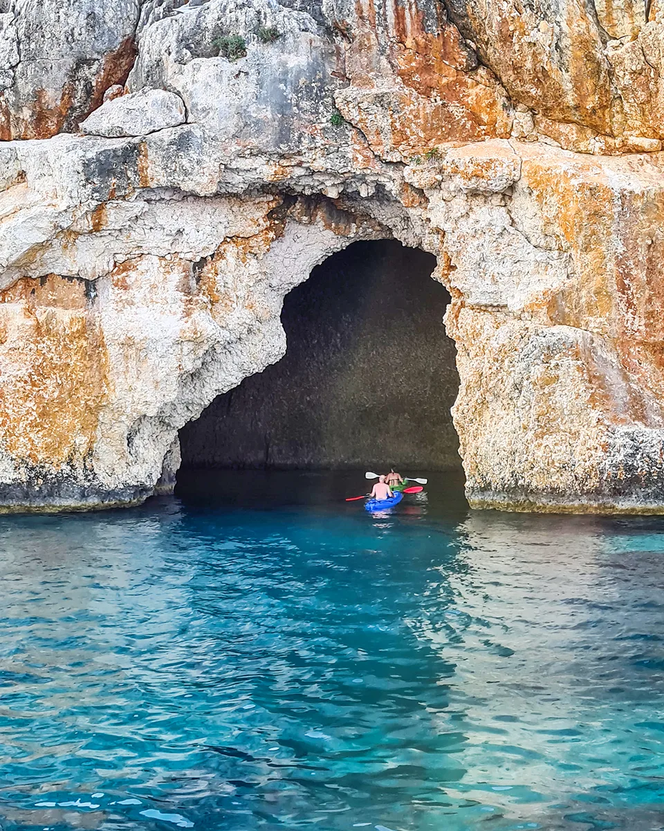 Mavi tur teknesinden kanoya atlayarak Korsan mağarasını ziyaret etmiştim. Küçük tekneler mağaranın ağzına kadar, hatta içine kadar giriyor. Tekne turlarının uğrak noktalarından olan mağaranın içerisinde yüzülebiliyor dense de siz yüzmeyin. Doğrusu biraz ürpertici gelirse de şaşırmayın.