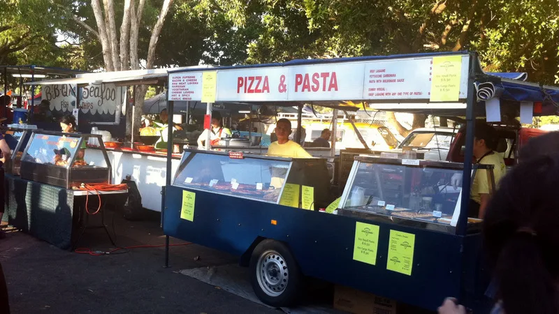 Market için kurulmuş yüzlerce stant var. Dünya mutfağın birçok lezzetini burada bulabilirsiniz. Meksika’dan, Yunanistan’a, Tayland, Çin, Kore, Endonezya, Malezya, Hong-Kong mutfağına kadar lezzetler bulabildiğiniz gibi Sri Lanka ve Hint ve Lübnan yemekleri de. Bizim kebap ve dönercileri aradım ama maalesef yoktu. Merkezi bir yere kurulmuş canlı müzik dinleyebileceğiniz gibi, sokak müzisyenlerinin kendi performanslarını sergilediği müzikleri de dinleyebilirsiniz. Yine kendine yer bulmuş şov yapan insanların etrafına da kalabalıklar birikiyordu.