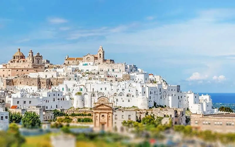Ostuni, Adriyatik kıyılarından sadece 8 km içeride, kıyıdan çok uzakta olmayan üç tepe üzerinde sanki güneşte ağartılmış gibi duran bir Orta çağ şehri. İsmini Yunanca ‘yeni şehir’ anlamına gelen ‘Astu-neon’ kelimesinden alıyor. Sahil ve çevresindeki ovanın muhteşem manzarasına hakim bir şehir.
