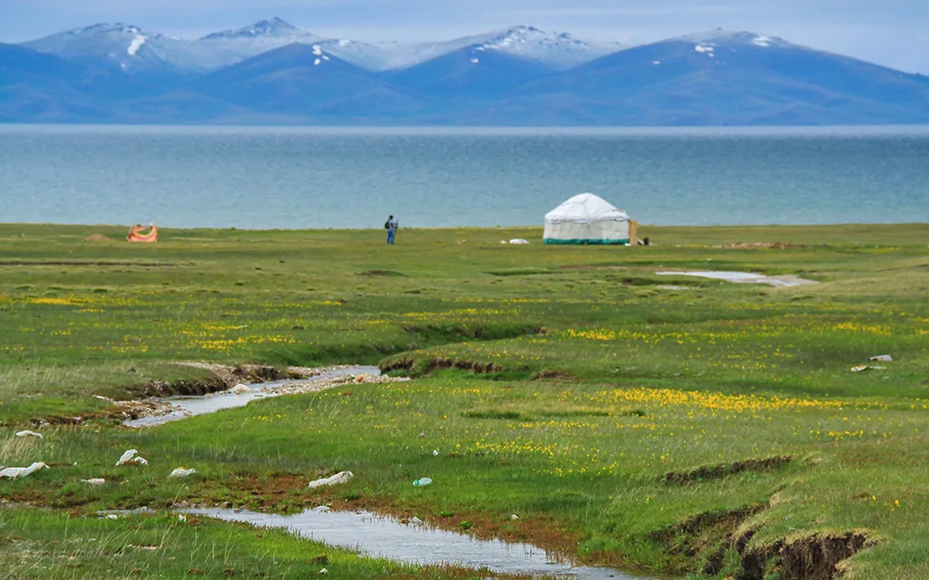 Dağların zirvesinde 3 bin metrede uzayıp giden bir bozkır düşünün, yanı başında zirvesi karlarla kaplı dağlar ve dağların arasında, zirvede parlak, kristal bir göl. Burası Kırgızistan‘ın ikinci en büyük gölü Song Kul Gölü. Hava muhtemelen insanın derisini kesiyormuşcasına soğuktur, ama etrafta hiçliğin getirdiği bir dinginlik, medeniyetten uzak bir ferahlık var. Çoğunluğu toprak yollardan geçilerek ulaşılan, yılın 8 ayı kapalı, kuş uçmaz, kervan geçmezmiş gibi duran bir yer. Cep telefonu çekmiyor, elektrik jeneratörden elde ediliyor. Deniz seviyesinden 3016 metre yüksekte tertemiz bir hava soluyorsunuz. Belki üşüyorsunuz ama üşeminin de güzel olduğunu hissediyorsunuz.