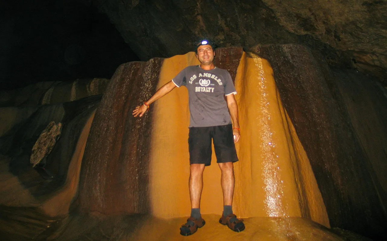 Kılavuzun elinde gazla çalışan lüks lambası var. Güçlü sarı ışığı nedeniyle travertenlerin sarı olan görüntüsünü mükemmelce ortaya çıkarıyordu. Şansı kaçırmayıp, bu macerada kendime ait olan tek fotoğrafımı çektirdim. Kılavuzumu sordular. Yalnız olduğumu söyleyince bana bakakaldılar. Neden öyle baktıklarını daha sonra anlayacaktım.