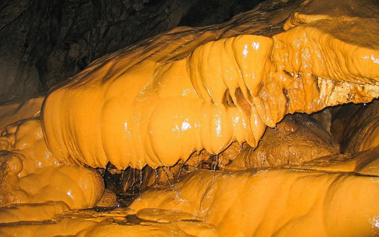 Pamukkale’nin travertenleri gibi ama rengi sarıya çalan göletlerden geçtim. Bu travertenler hiç kaygan olmadığı için çok rahat ilerlemeye başladım. İçimden hiç de kılavuza gerek yokmuş diye geçiriyordum. Bu travertenler mağaranın en dikkat çeken ve en güzel oluşumları. Bazılarının yüksekliği 2 metreyi bulup.