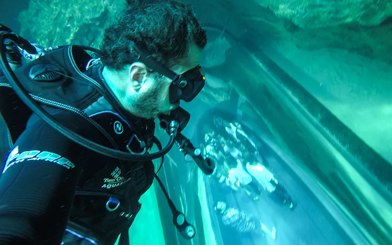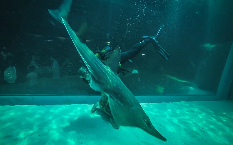 I&J Yırtıcı Sergisinde akrilik 4 metre yüksekliğinde, 11 metre genişliğinde pencereden Kumkaplanı köpekbalıklarını izlemek heyecan verici. Eğer PADI deniz dalış sertifikanız bulunuyorsa köpek balıkları ve kaplumbağaların, mantraların olduğu devasa akvaryumda dalış yapabiliyorsunuz. Ben daldım, olağanüstü bir deneyimdi. Köpekbalıkları ve kaplumbağalarla yüzdüm.