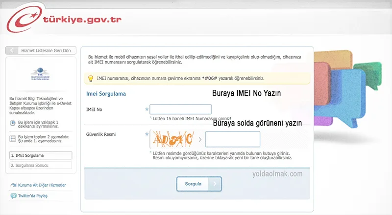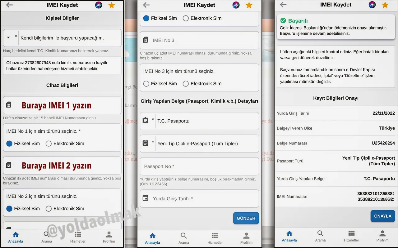 IMEI numaralarını girerken çok dikkatli olun. Çift SIM’li telefonlarda her iki IMEI’yi de yazın, tek SIM’liyse ikinci alanı boş bırakın. Bazıları ikinci IMEI alanına başka telefon numarası yazıp tek ödemeyle iki kayıt yapmaya çalışıyor – bu yasak ve riskli.