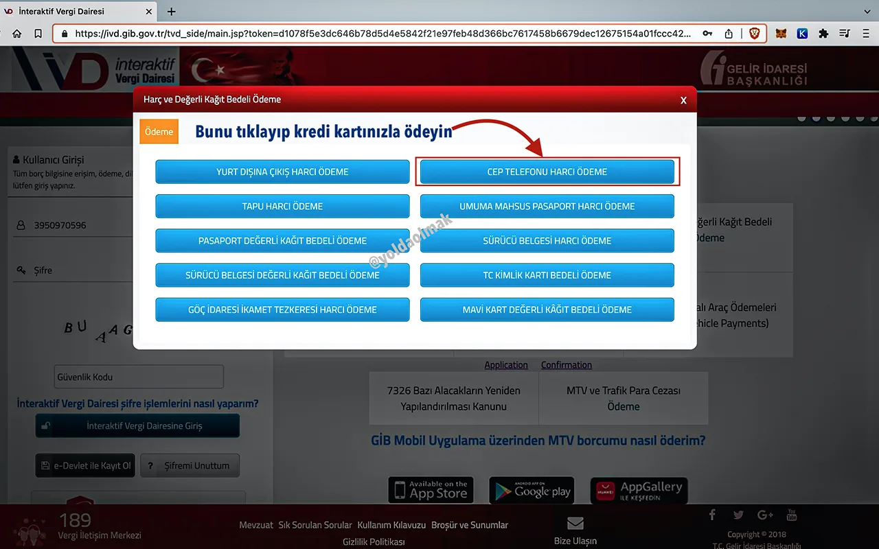 İnternet üzerinden ödeme için ivd.gib.gov.tr adresine girin. Harç ve Değerli Kağıt Bedeli bölümünü seçin, ardından Cep Telefonu Harcını Öde seçeneğine tıklayın. TC kimlik numaranızı, pasaporttaki adınızı, soyadınızı ve IMEI numarasını eksiksiz girin.